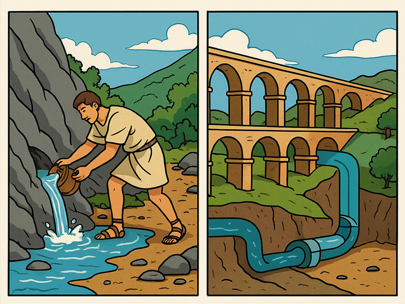 Współczesna eksploatacja wodociągów stoi dziś przed analogicznymi wyzwaniami. Różnica polega na zastosowanych narzędziach: zamiast dłut i octu oraz ludzi penetrujących z pochodniami wnętrza akweduktów, korzystamy z urządzeń hydrodynamicznych, tłoków czyszczących i inteligentnych, kamer inspekcyjnych i elektronicznych urządzeń diagnostycznych.